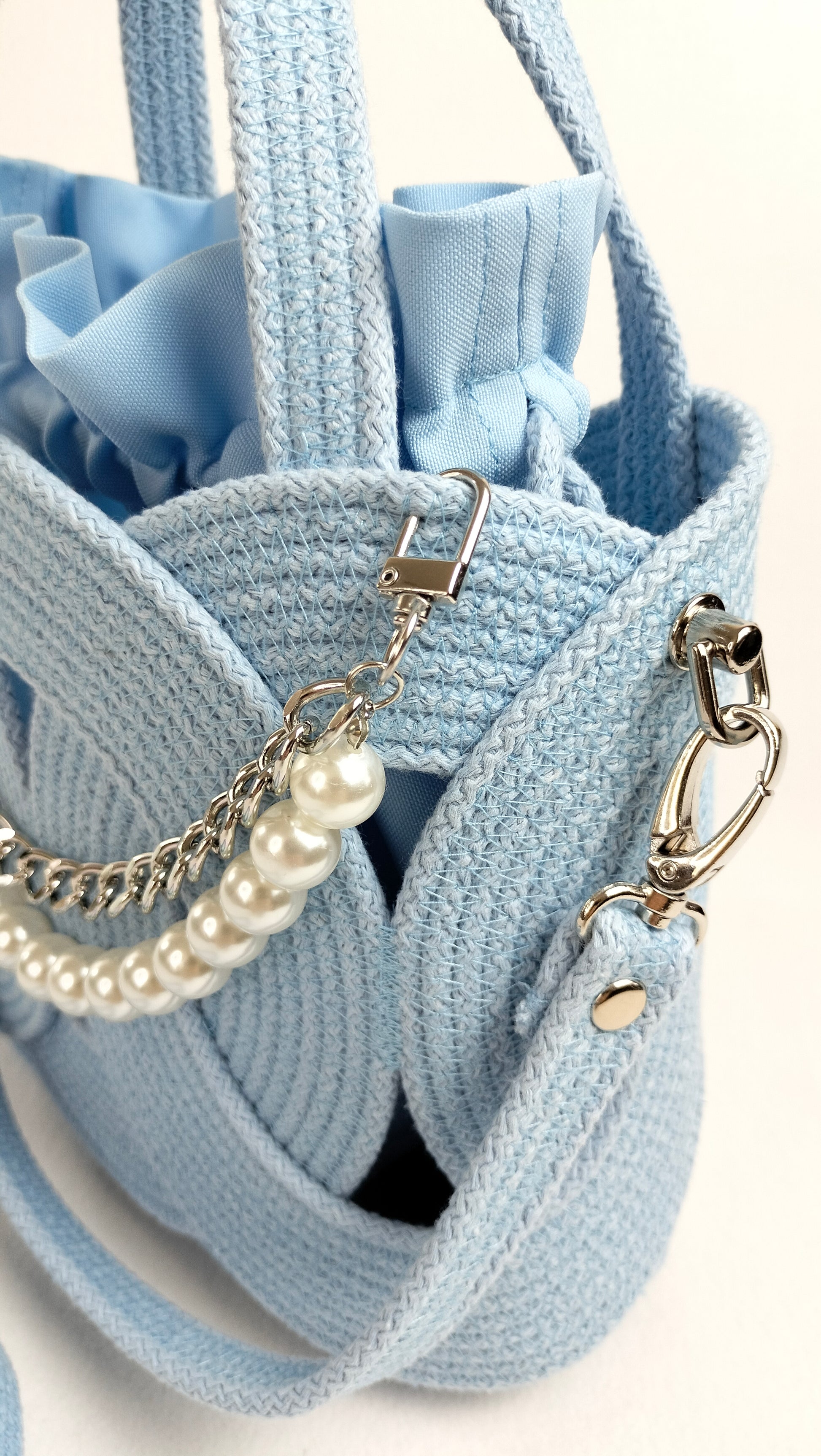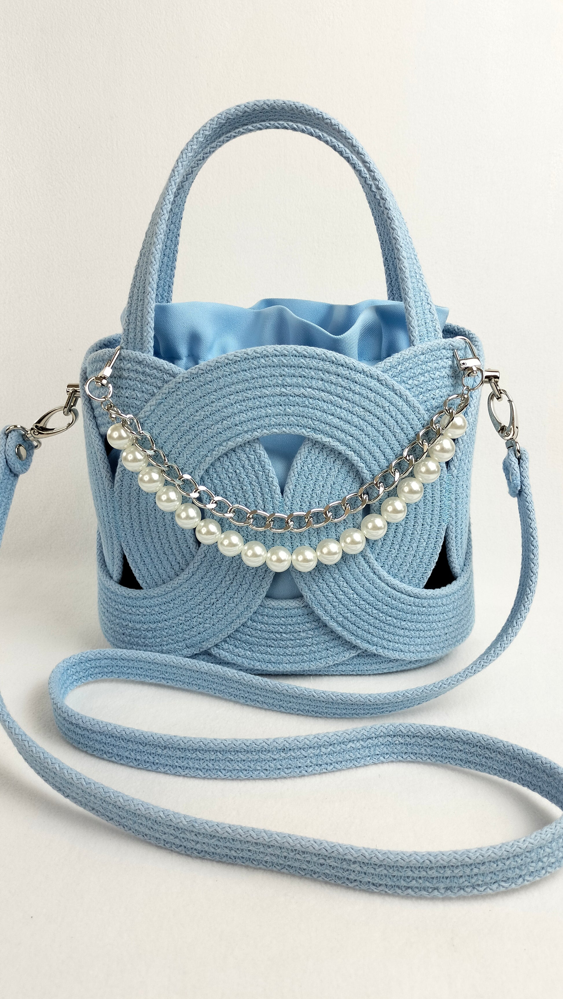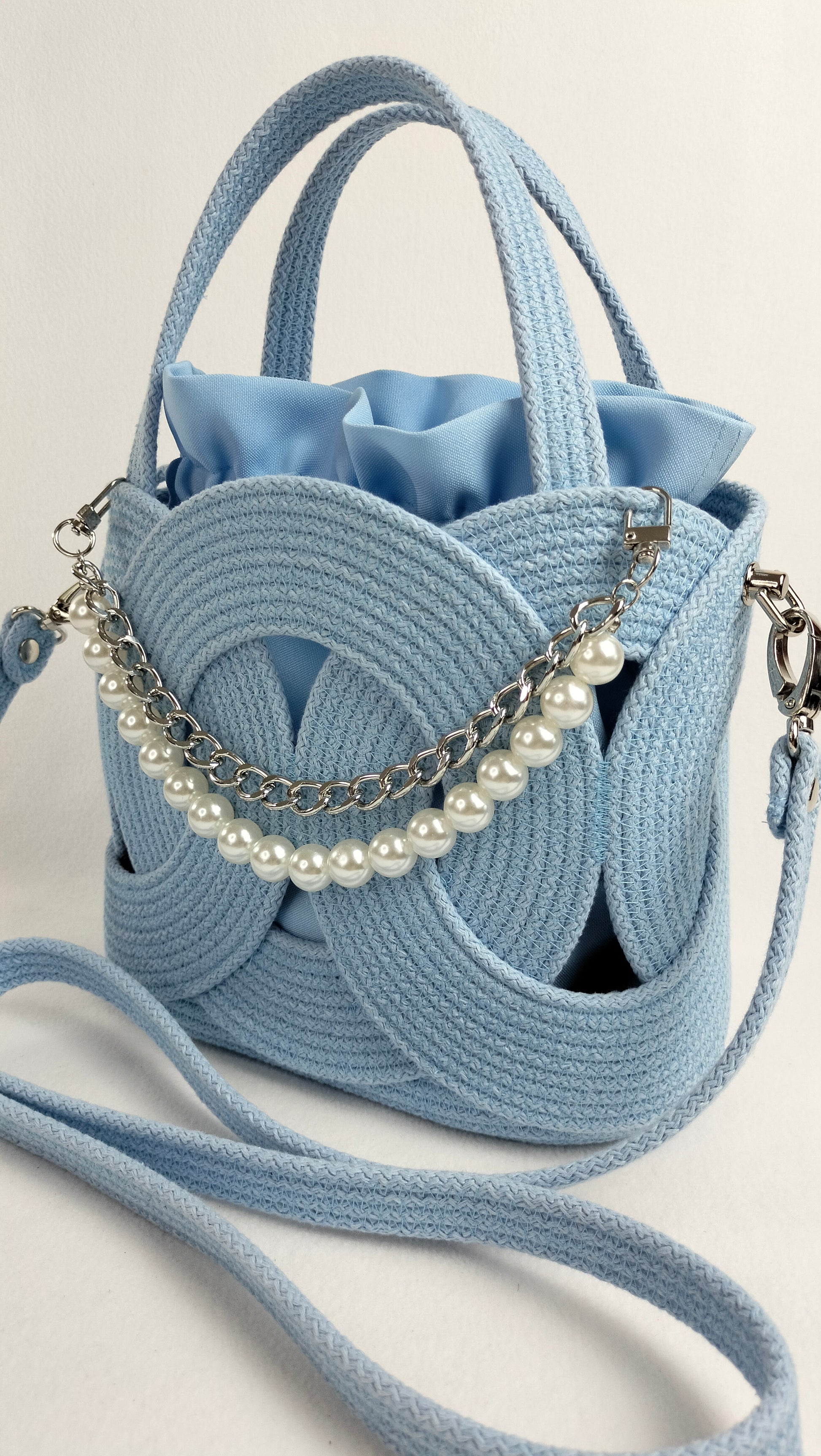This charming handbag in a gentle light blue shade is crafted from durable stitched cotton cord with a solid core. Its elegant ring-based structure is enhanced with delicate pearl accents and a nickel-finish chain that adds a refined touch.