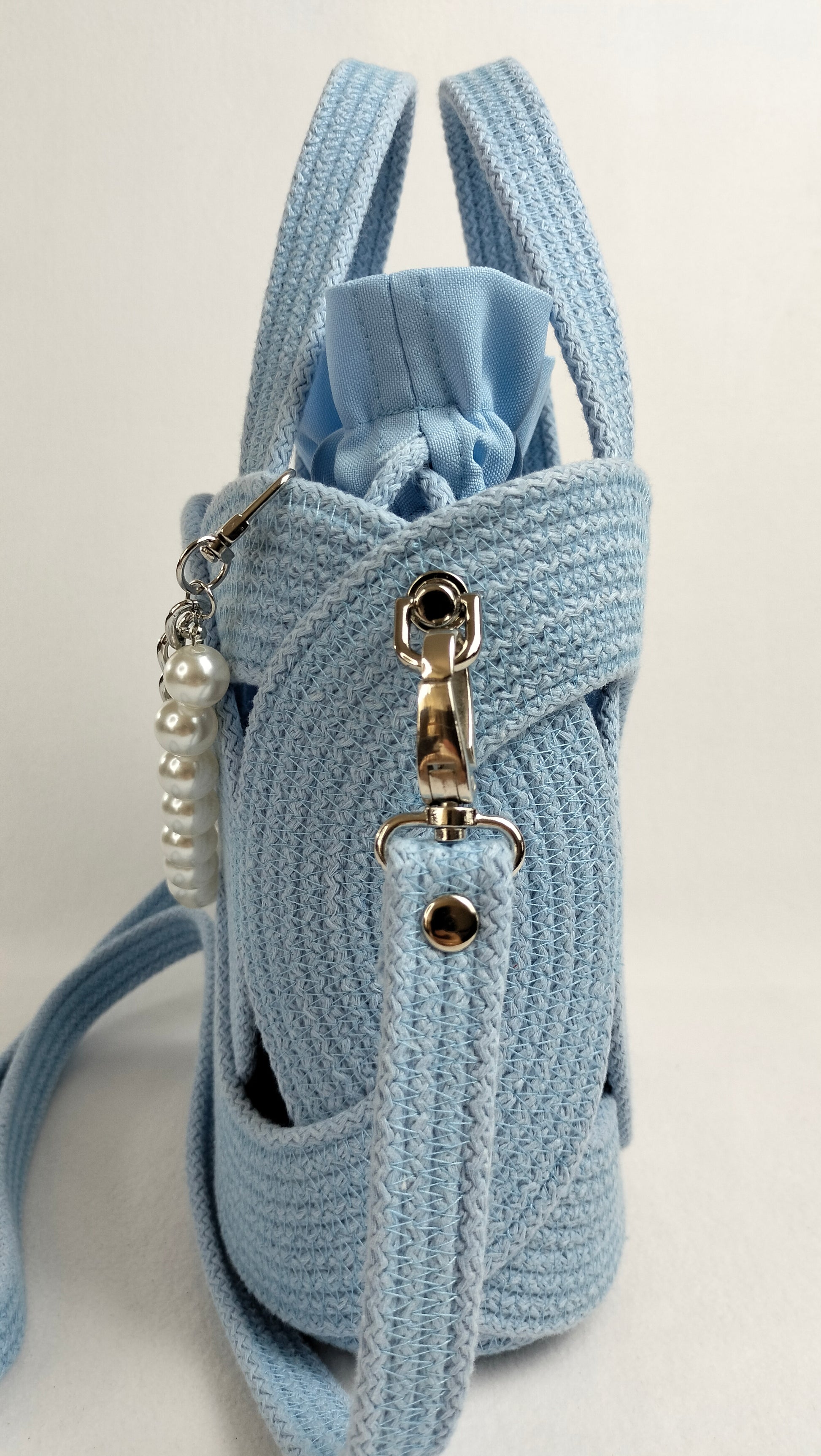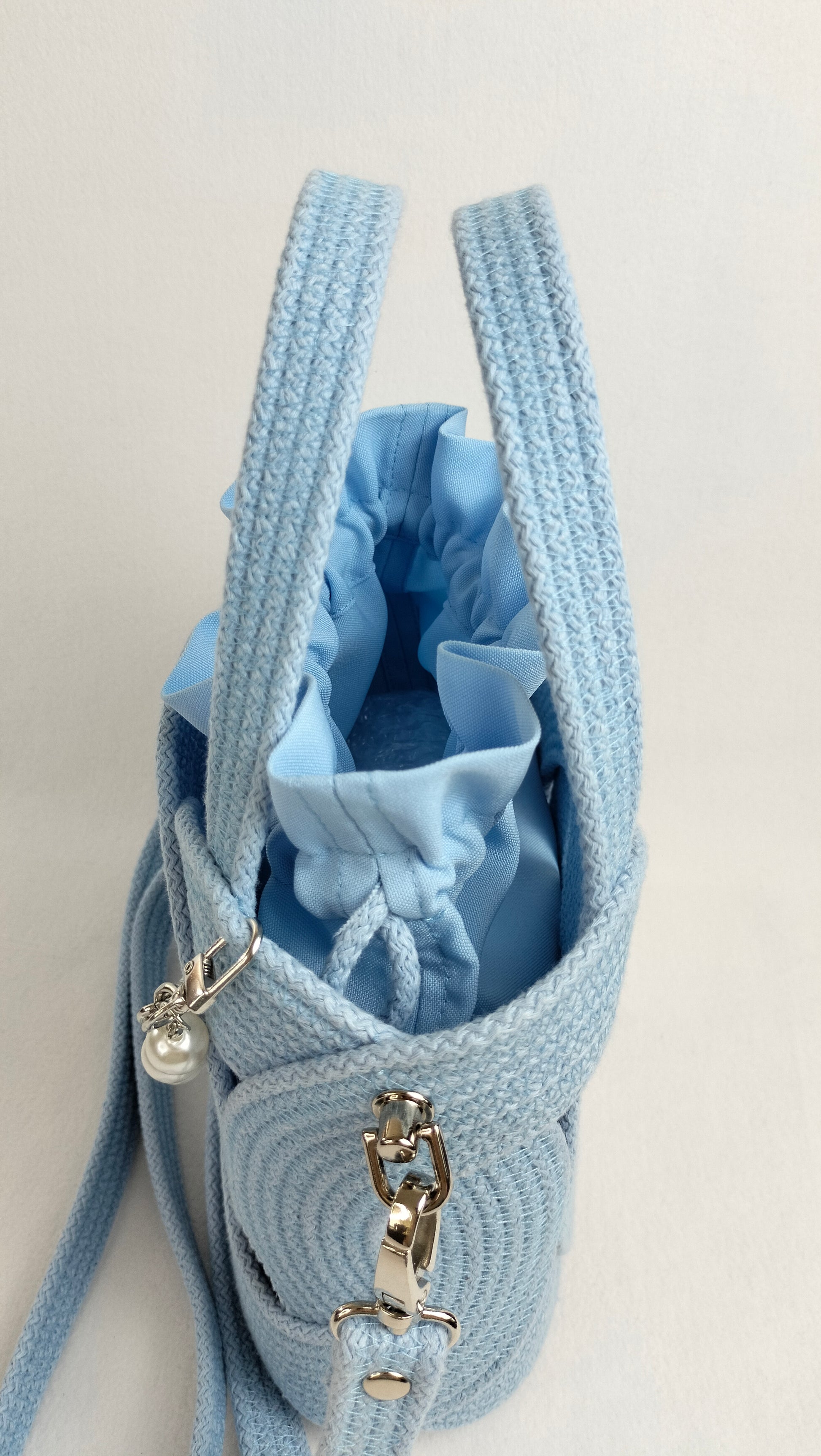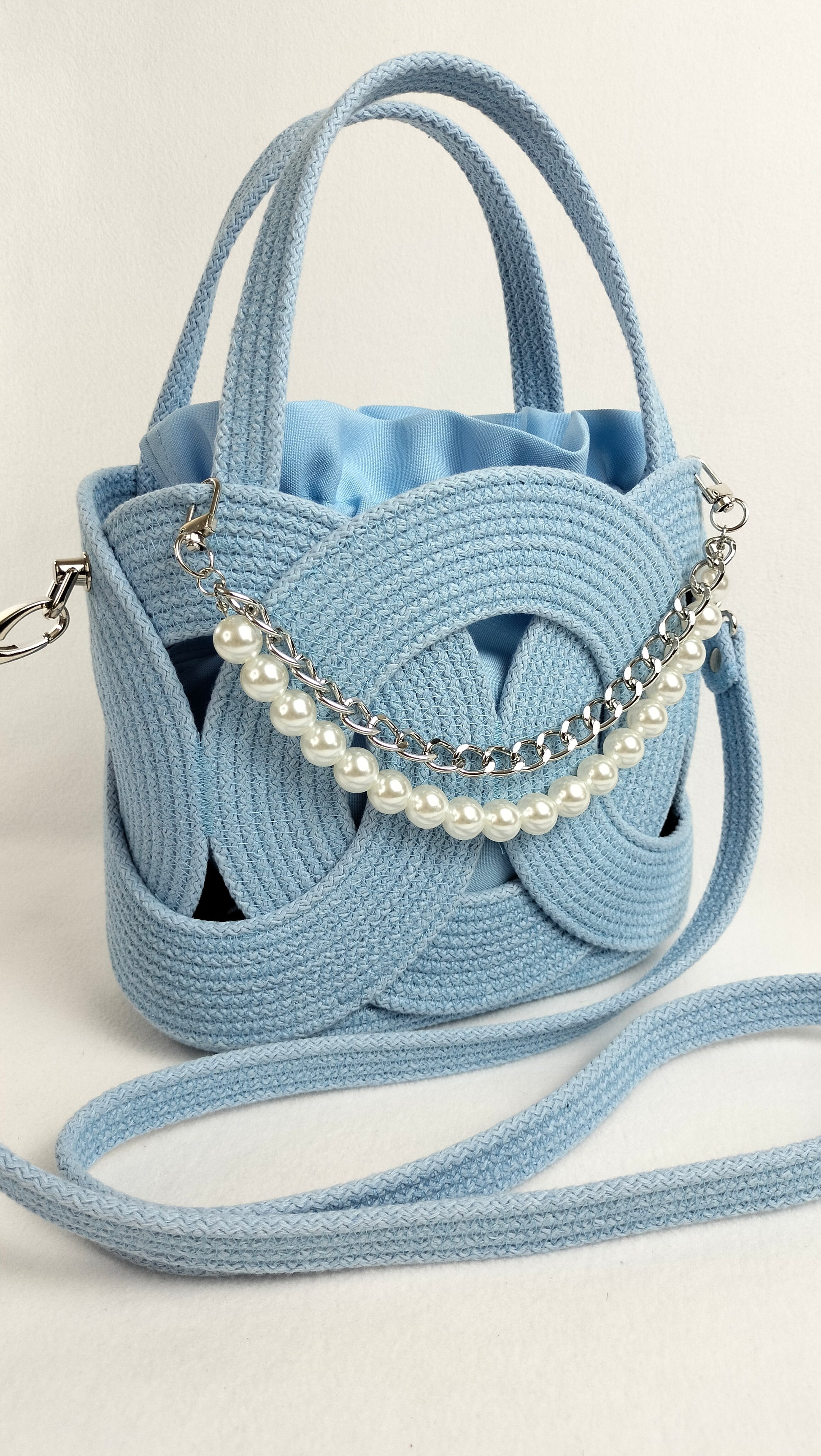 This charming handbag in a gentle light blue shade is crafted from durable stitched cotton cord with a solid core. Its elegant ring-based structure is enhanced with delicate pearl accents and a nickel-finish chain that adds a refined touch.
