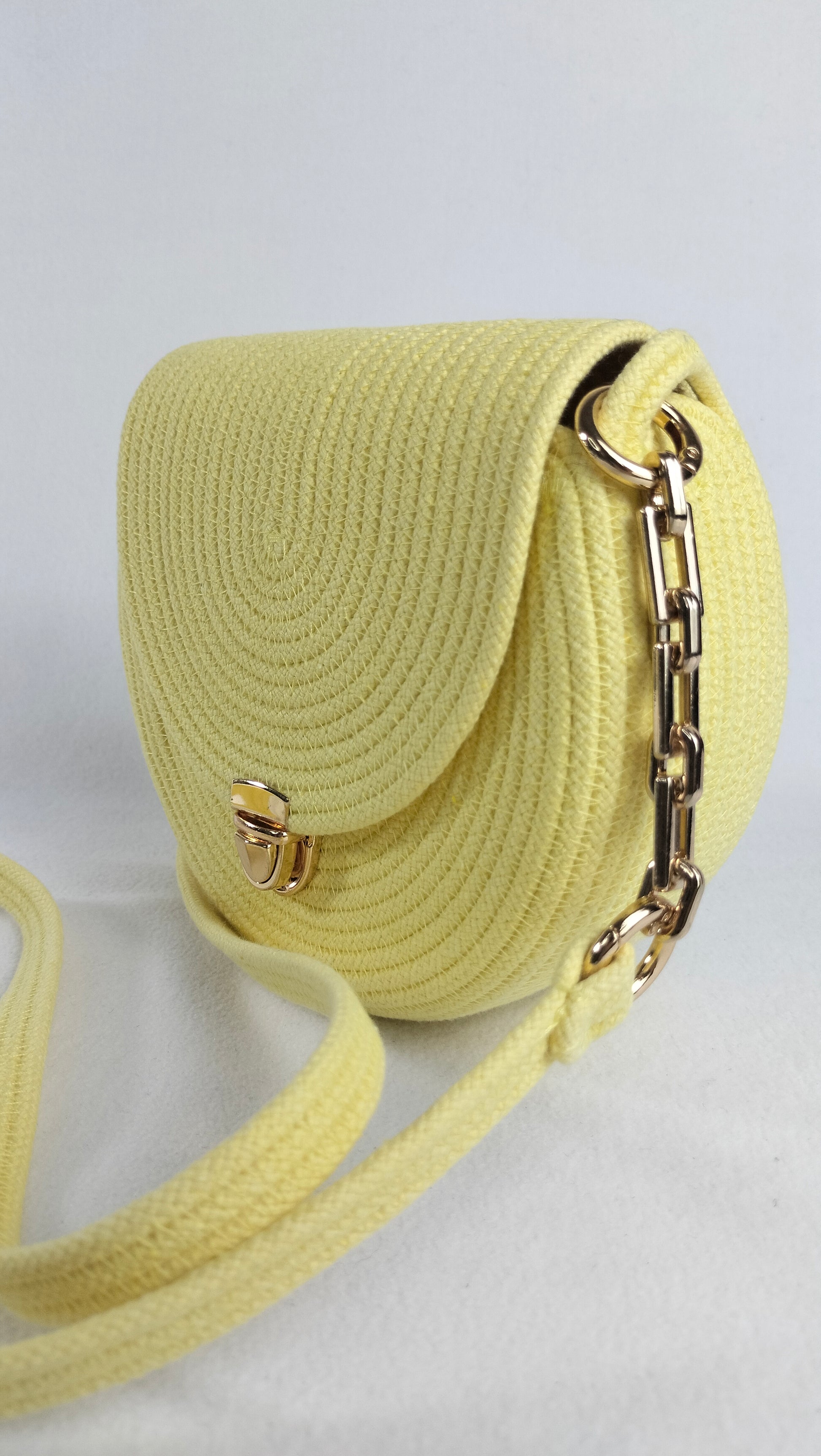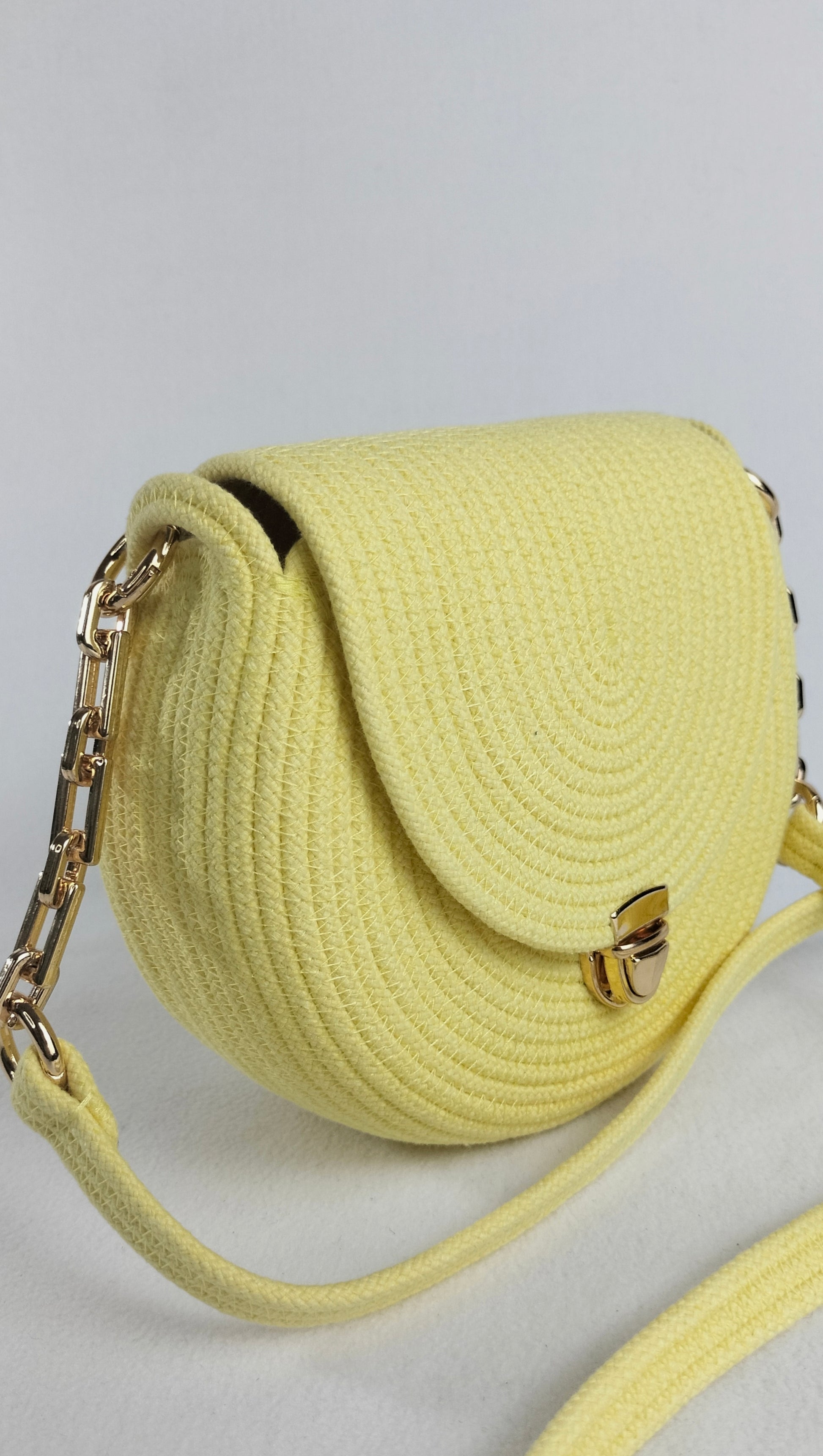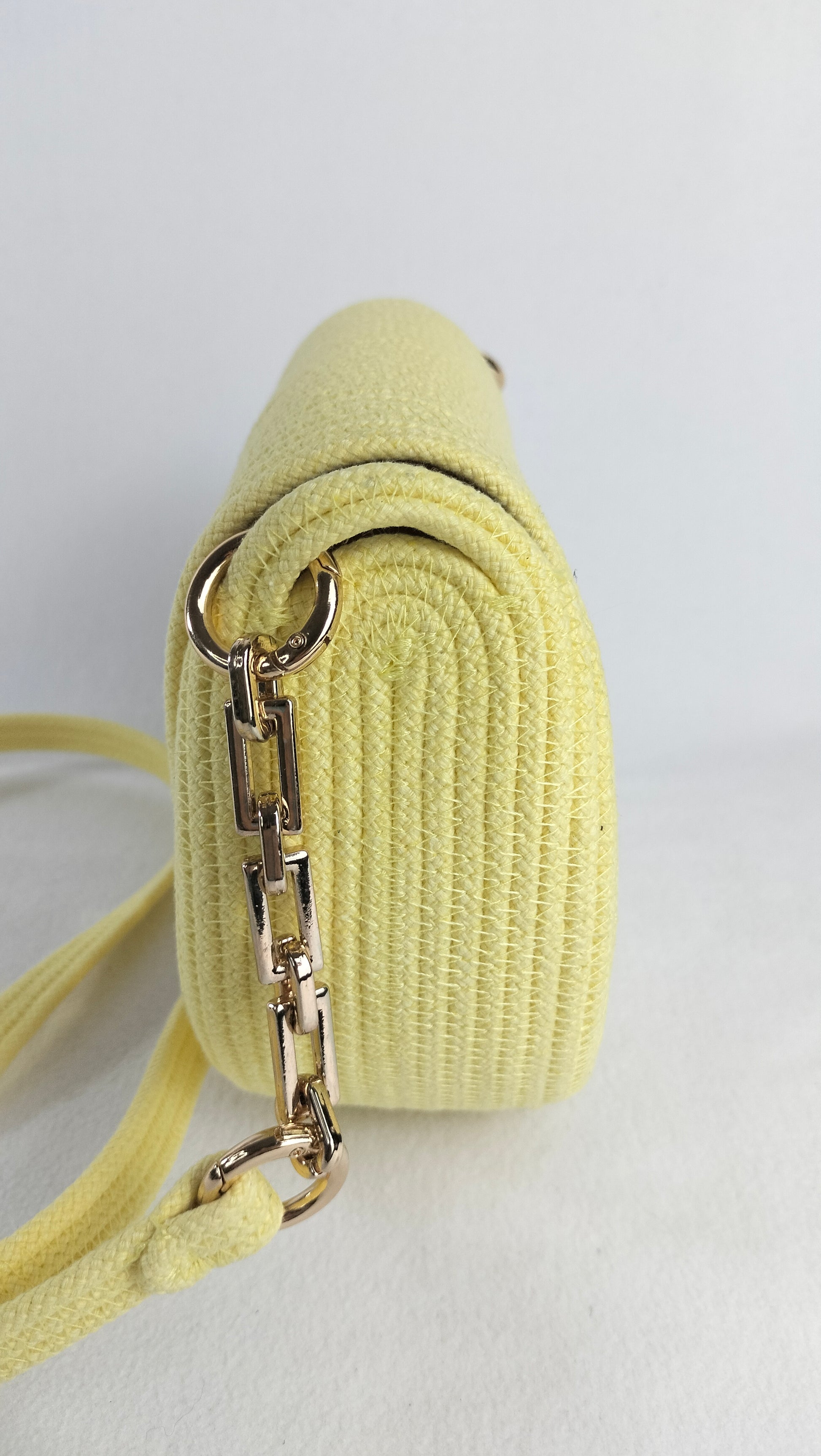 Crafted from cotton cord in a vibrant yellow shade, it features a seamless flap closure and elegant chain details on both sides of the shoulder strap — adding length and a playful touch.