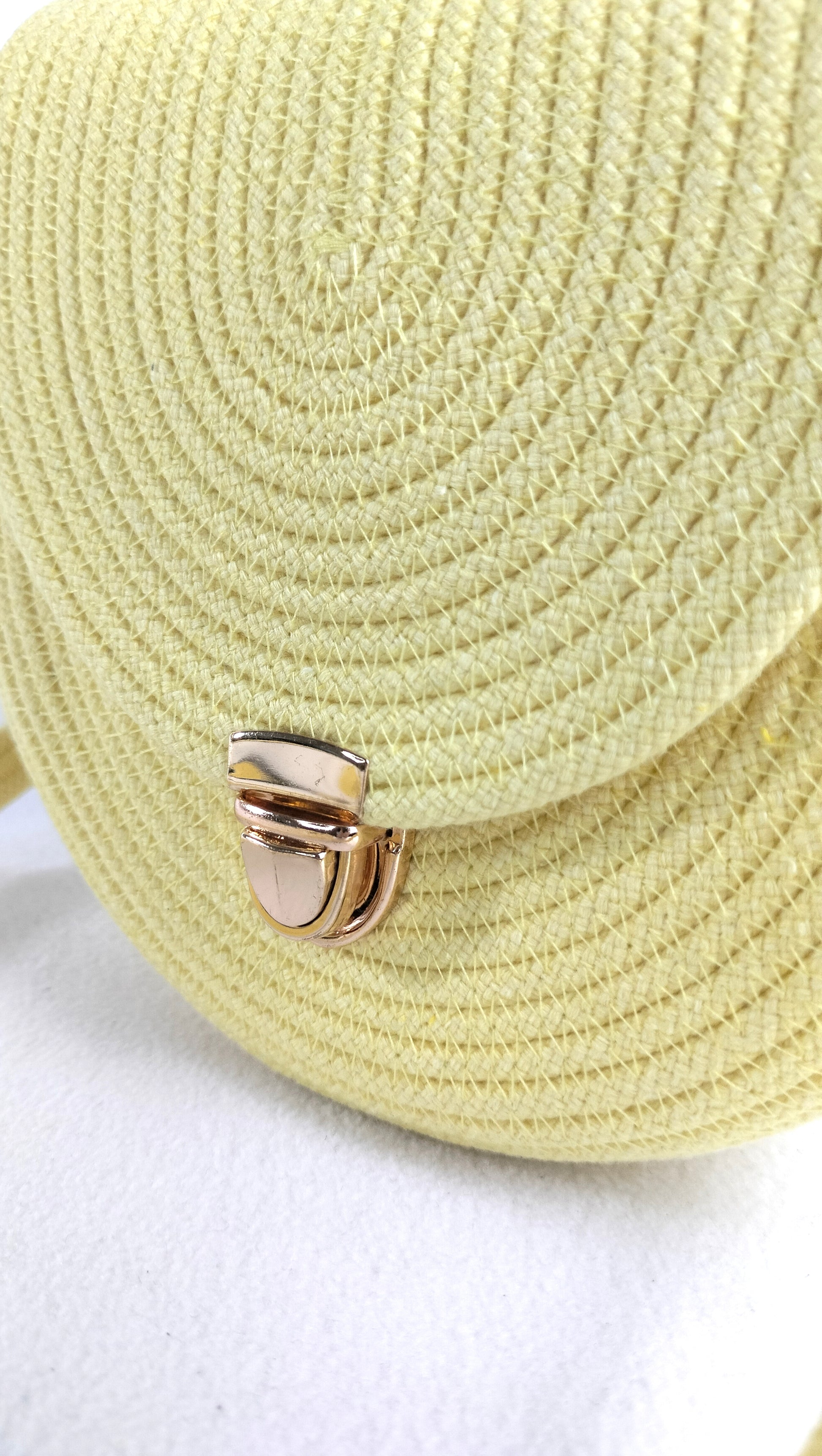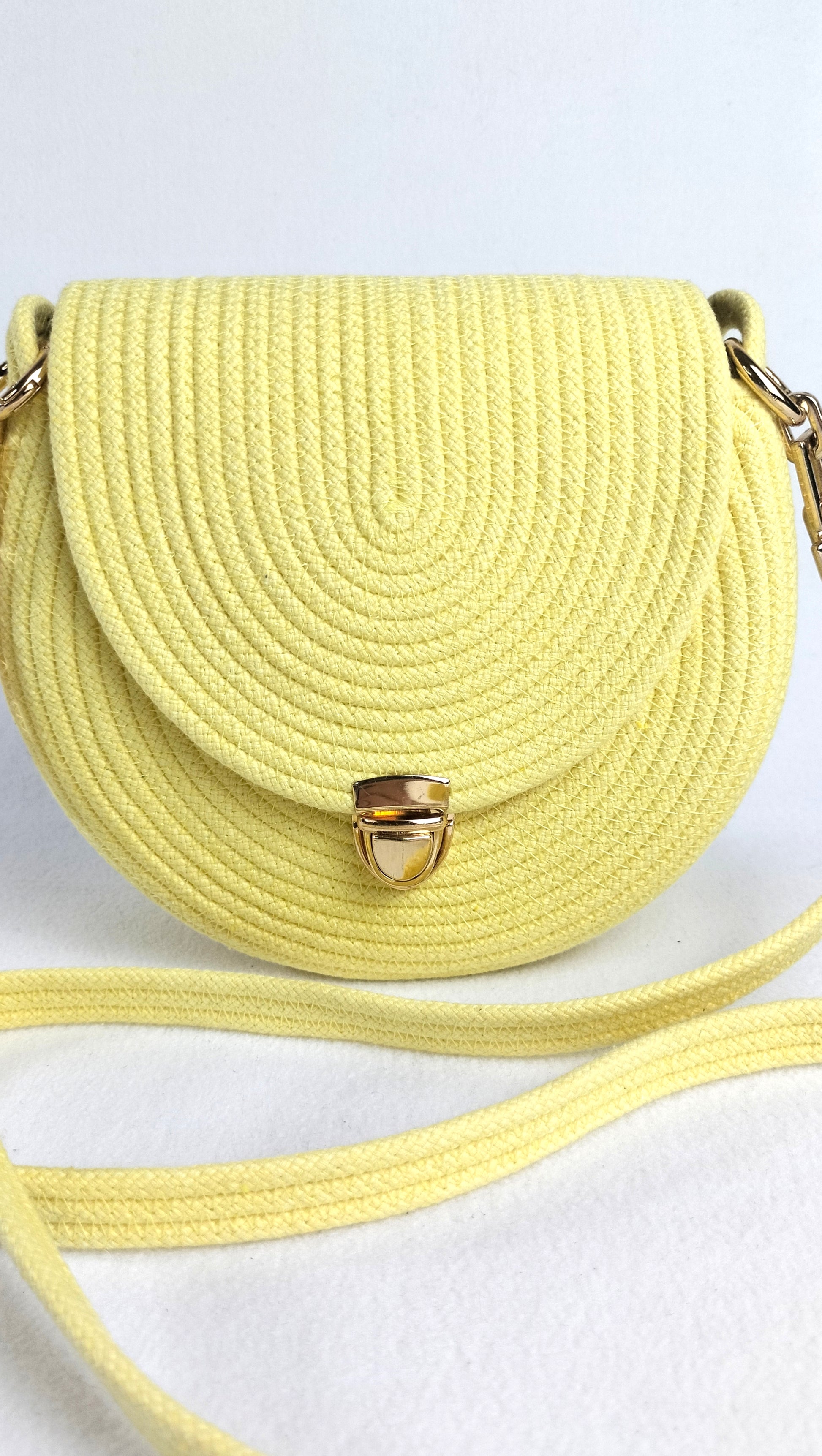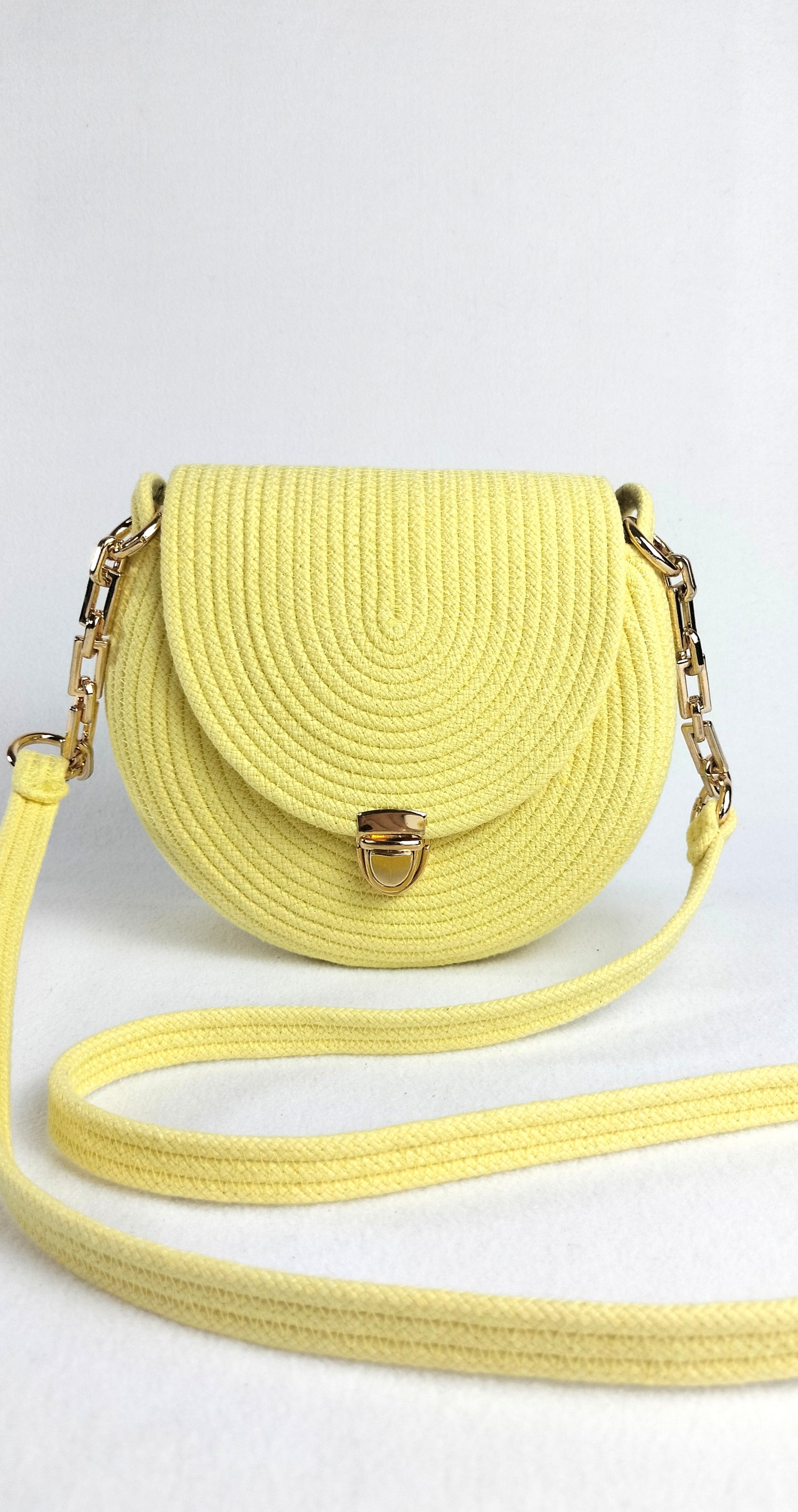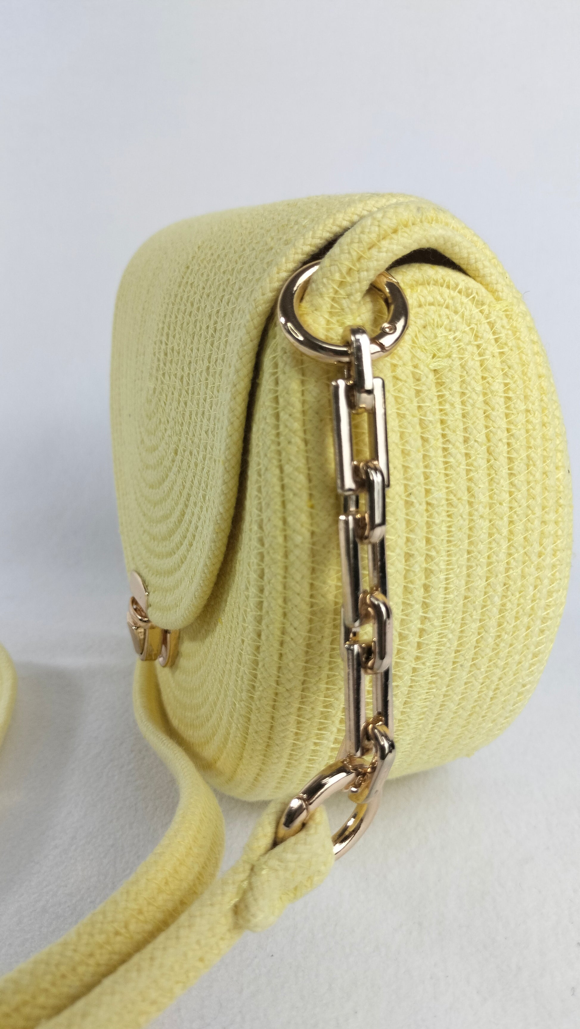 Crafted from cotton cord in a vibrant yellow shade, it features a seamless flap closure and elegant chain details on both sides of the shoulder strap — adding length and a playful touch.