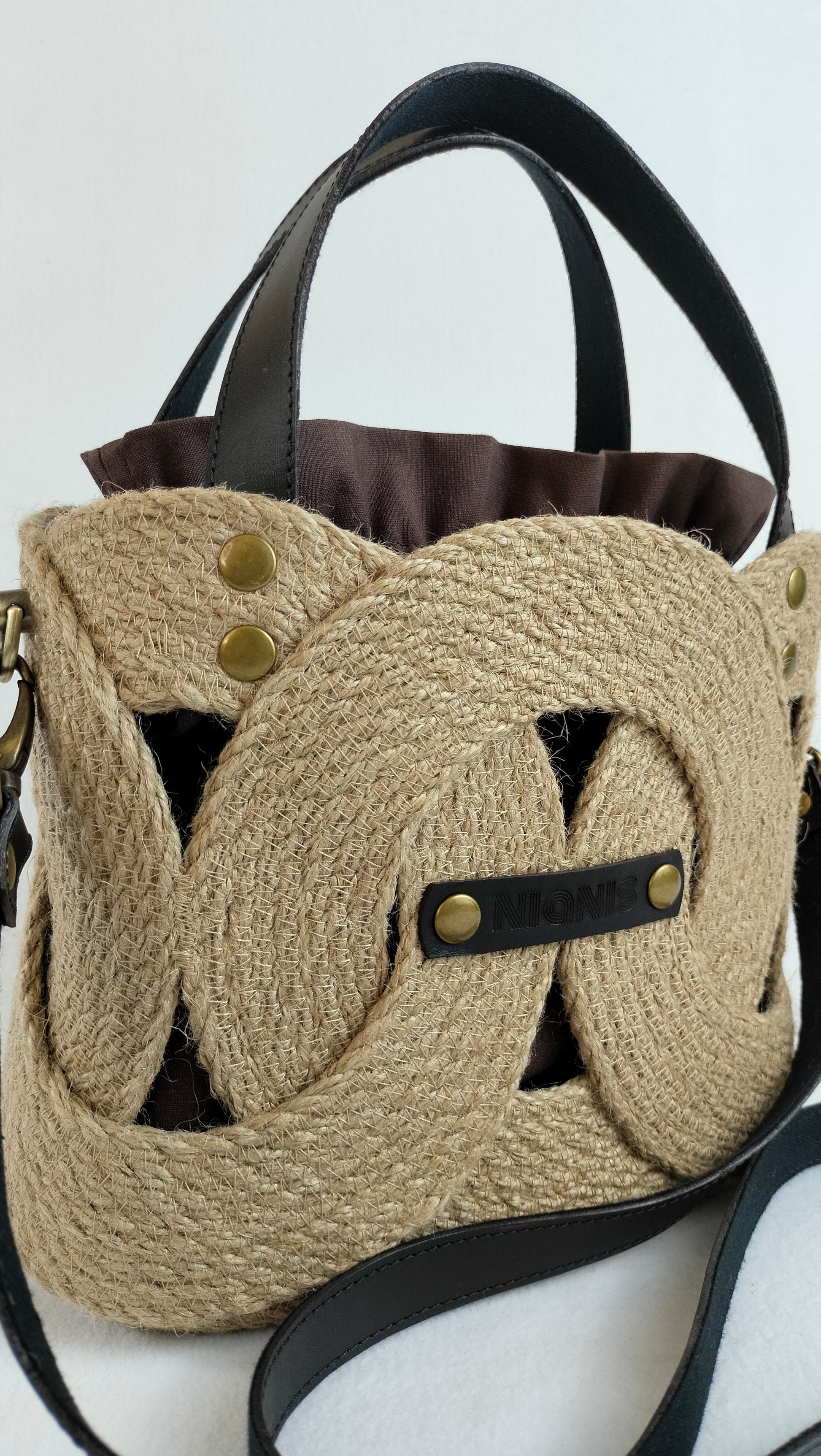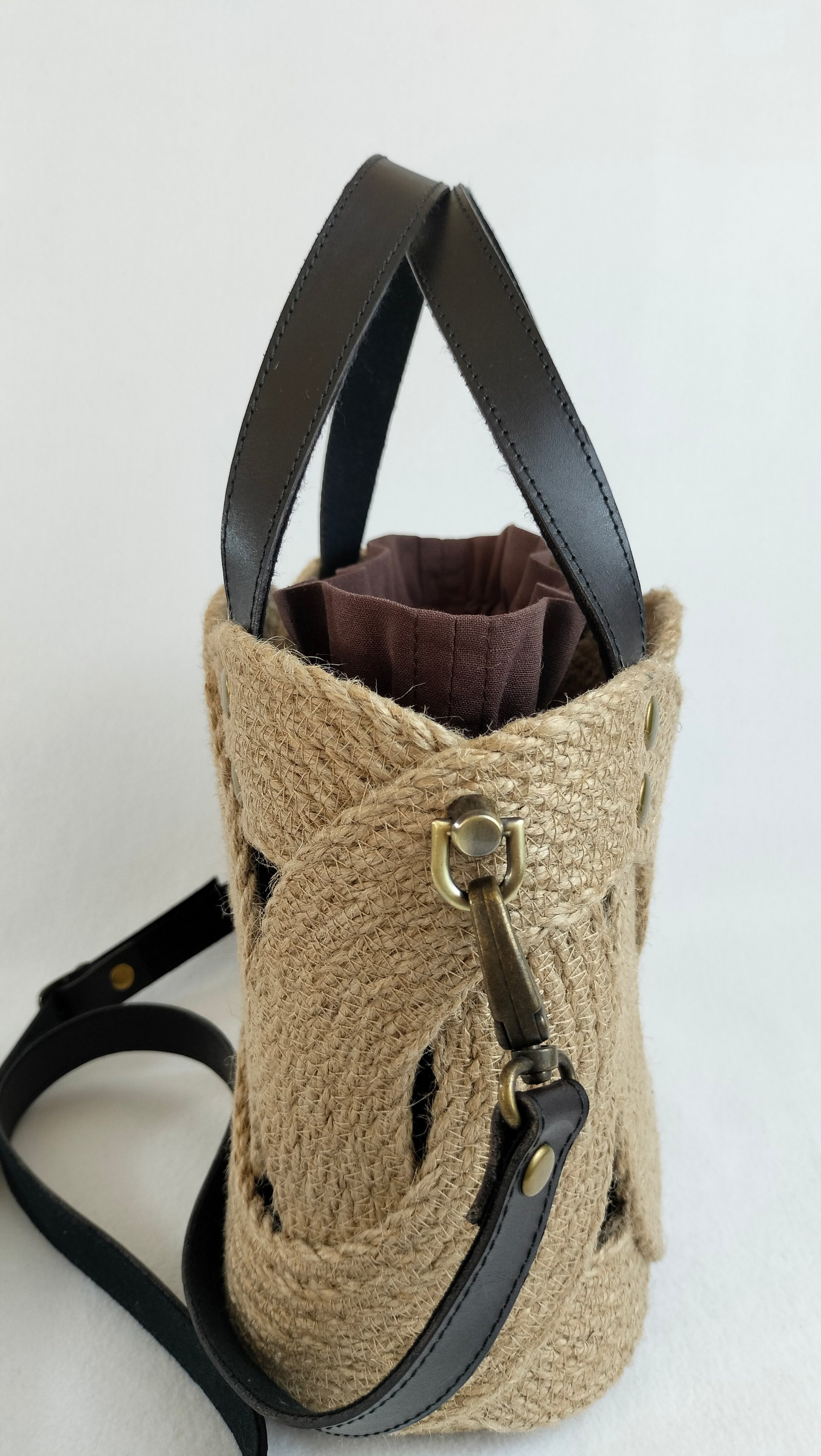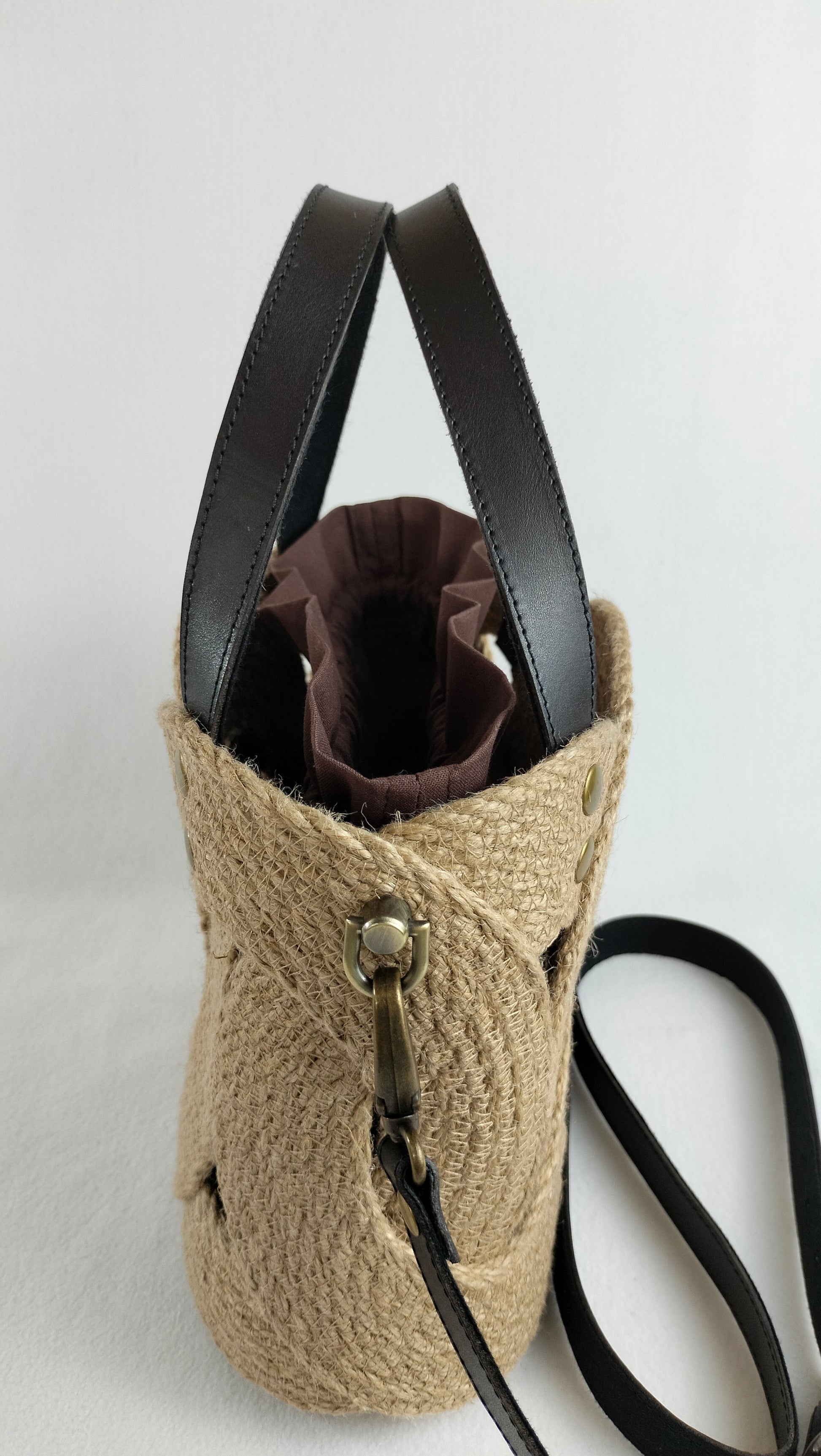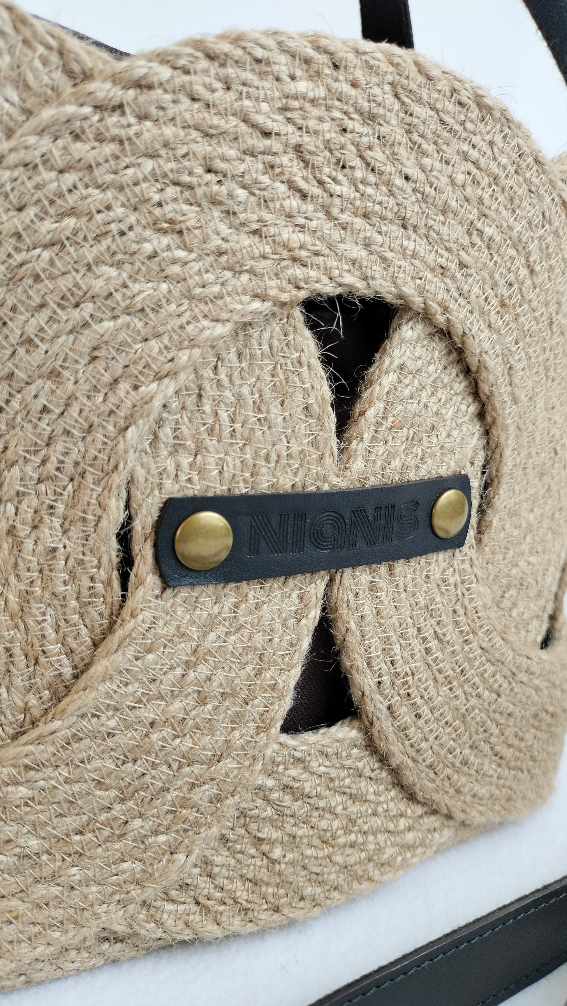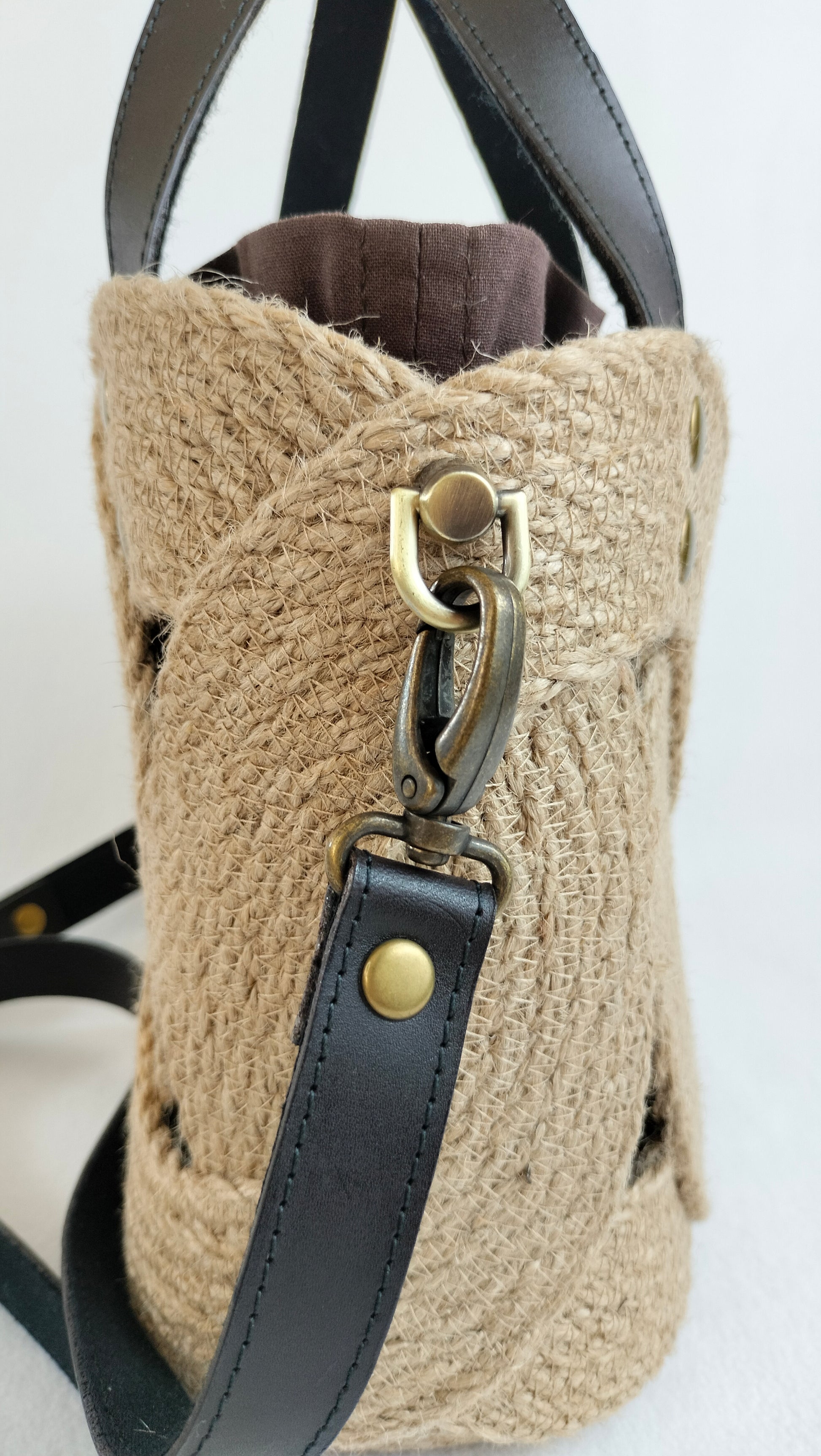This medium-sized bag is crafted from durable jute and features genuine leather handles in a rich chocolate tone. Antique-style metal hardware adds a vintage charm and character.