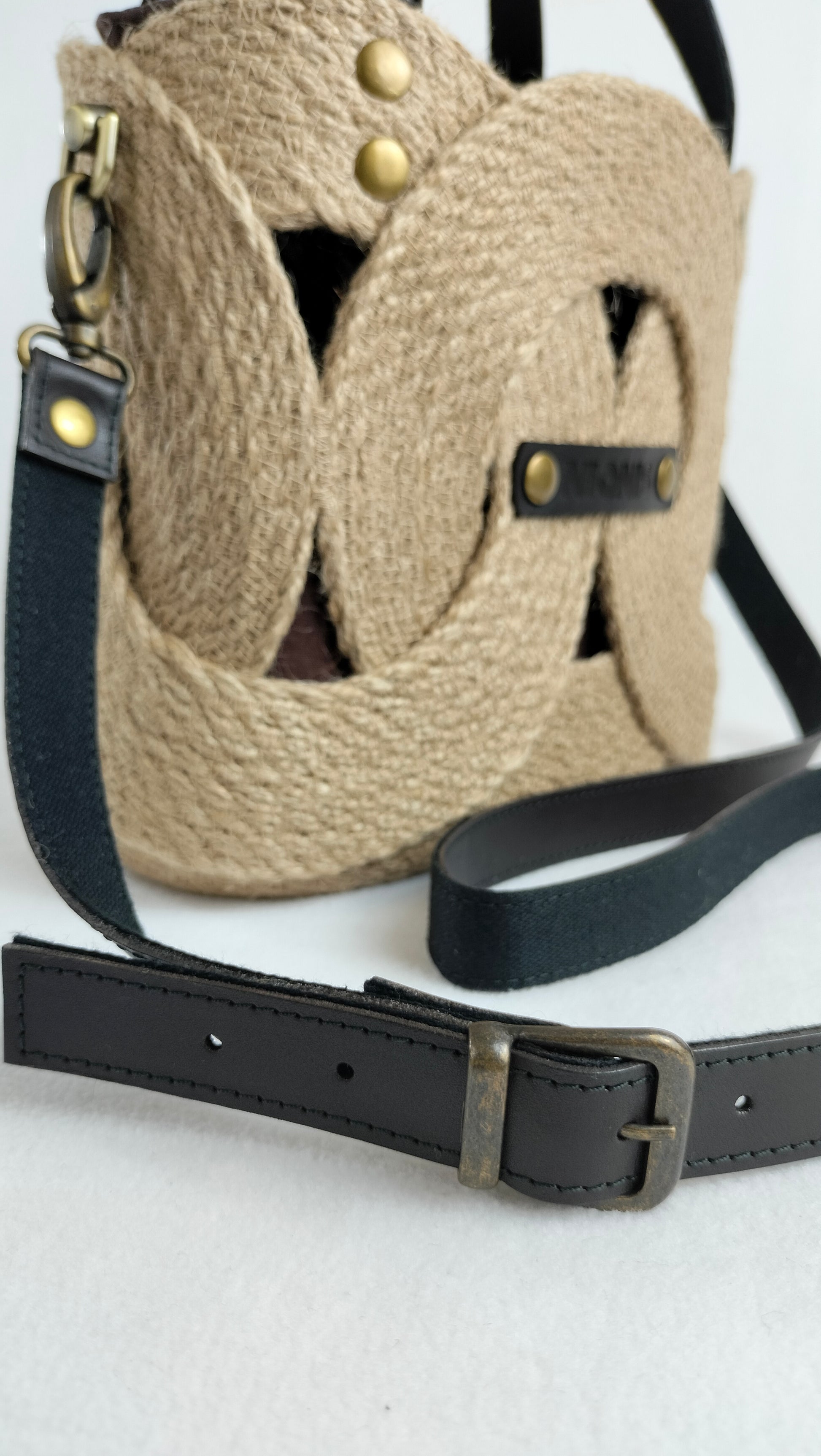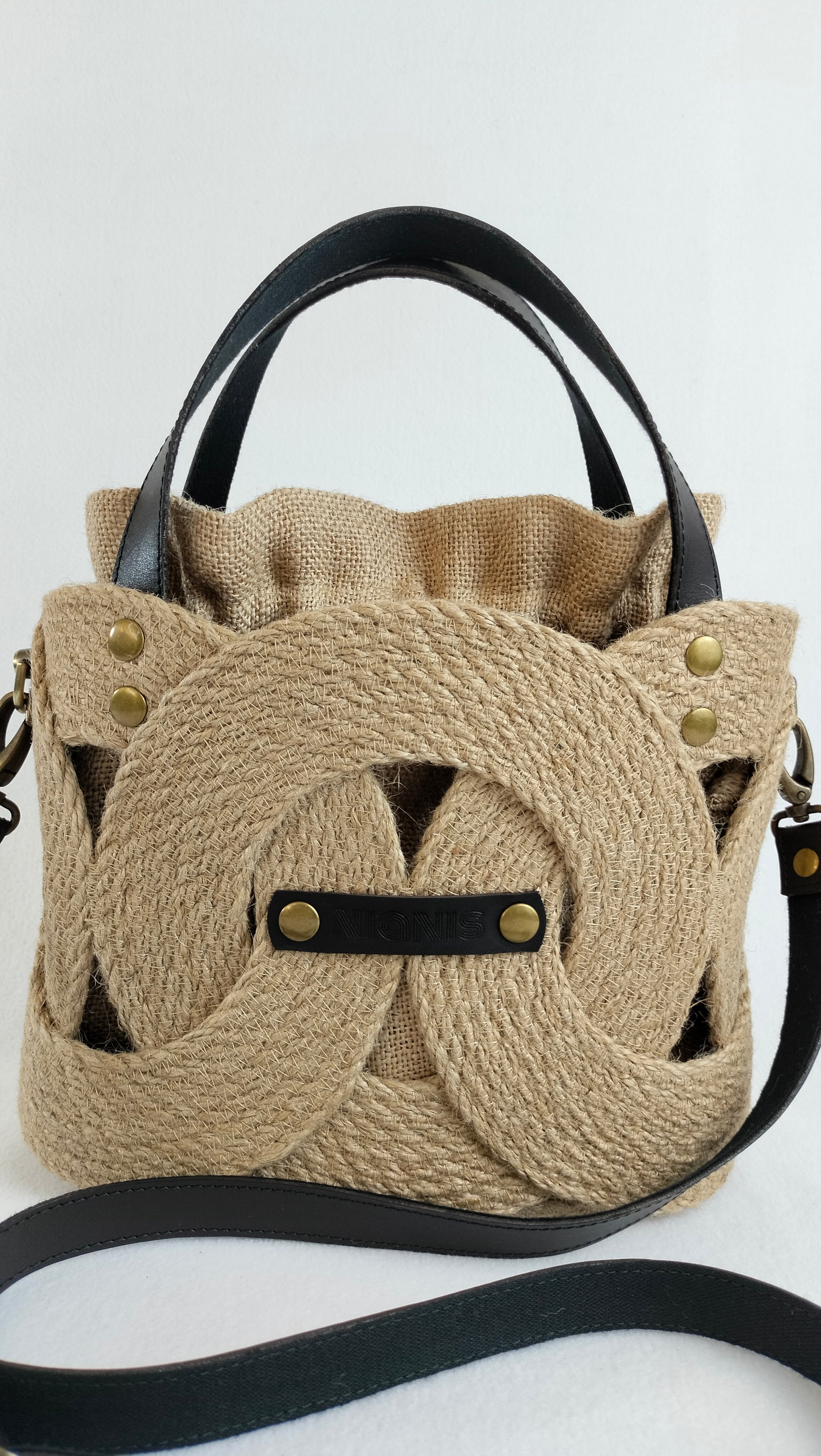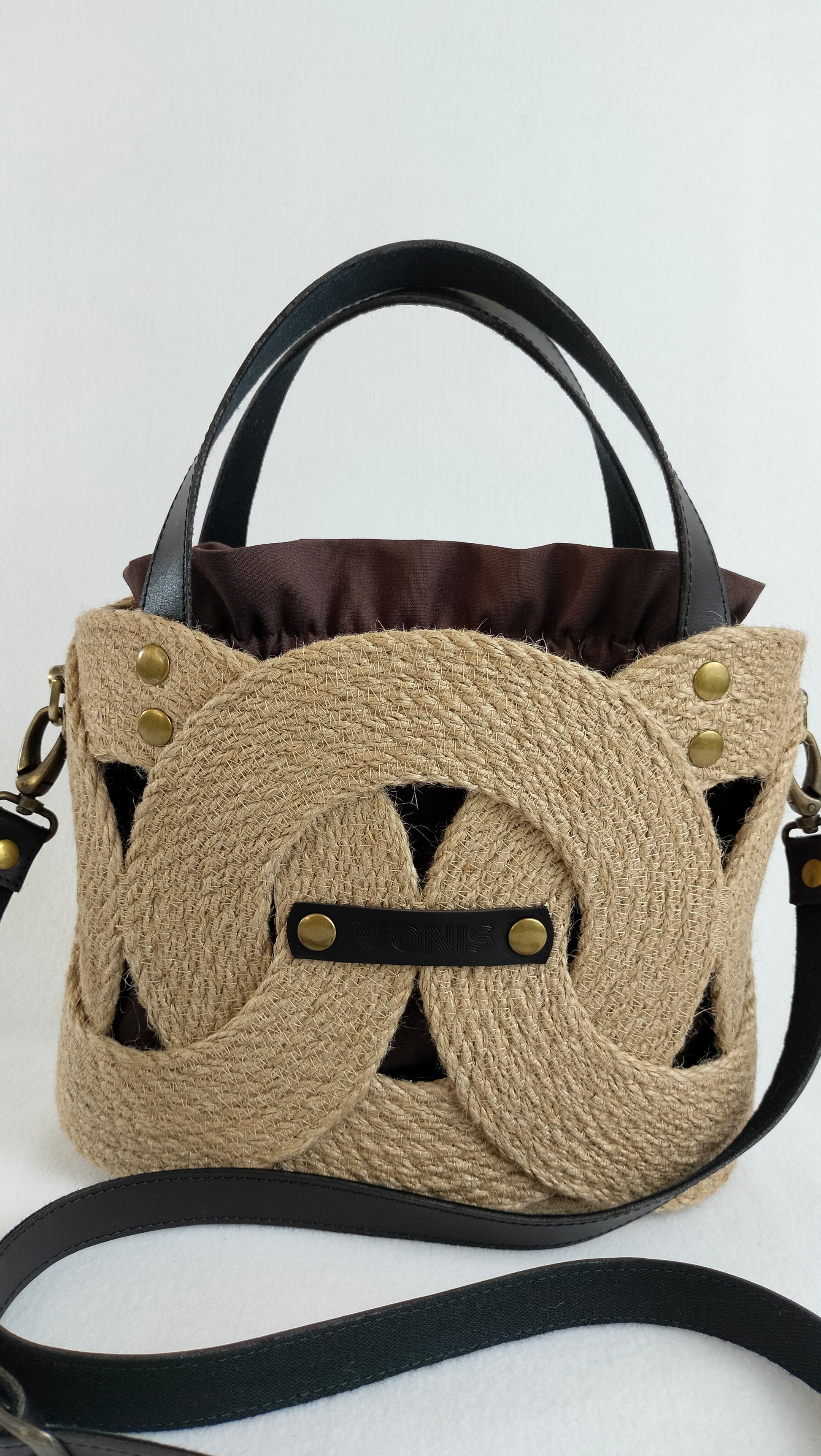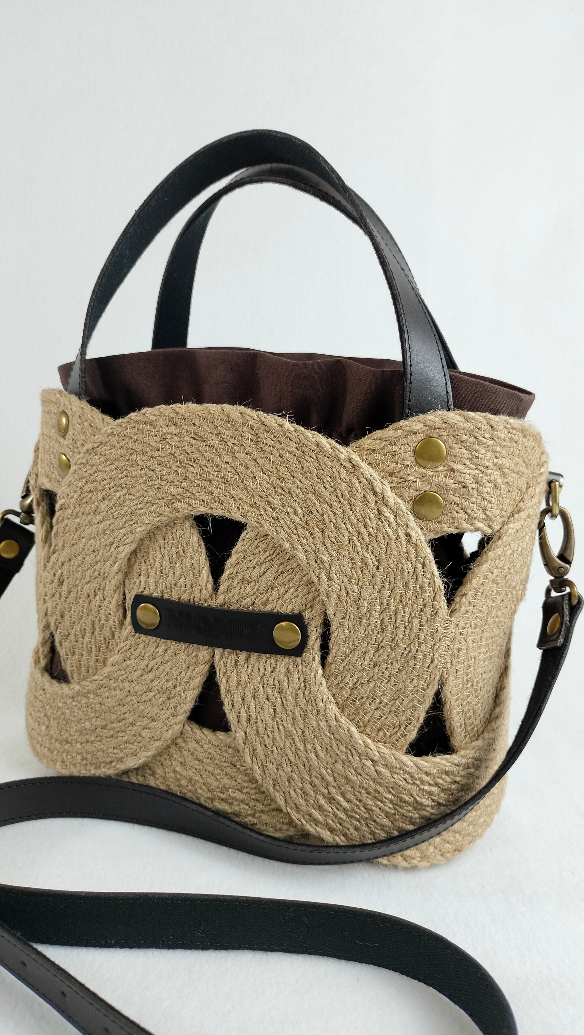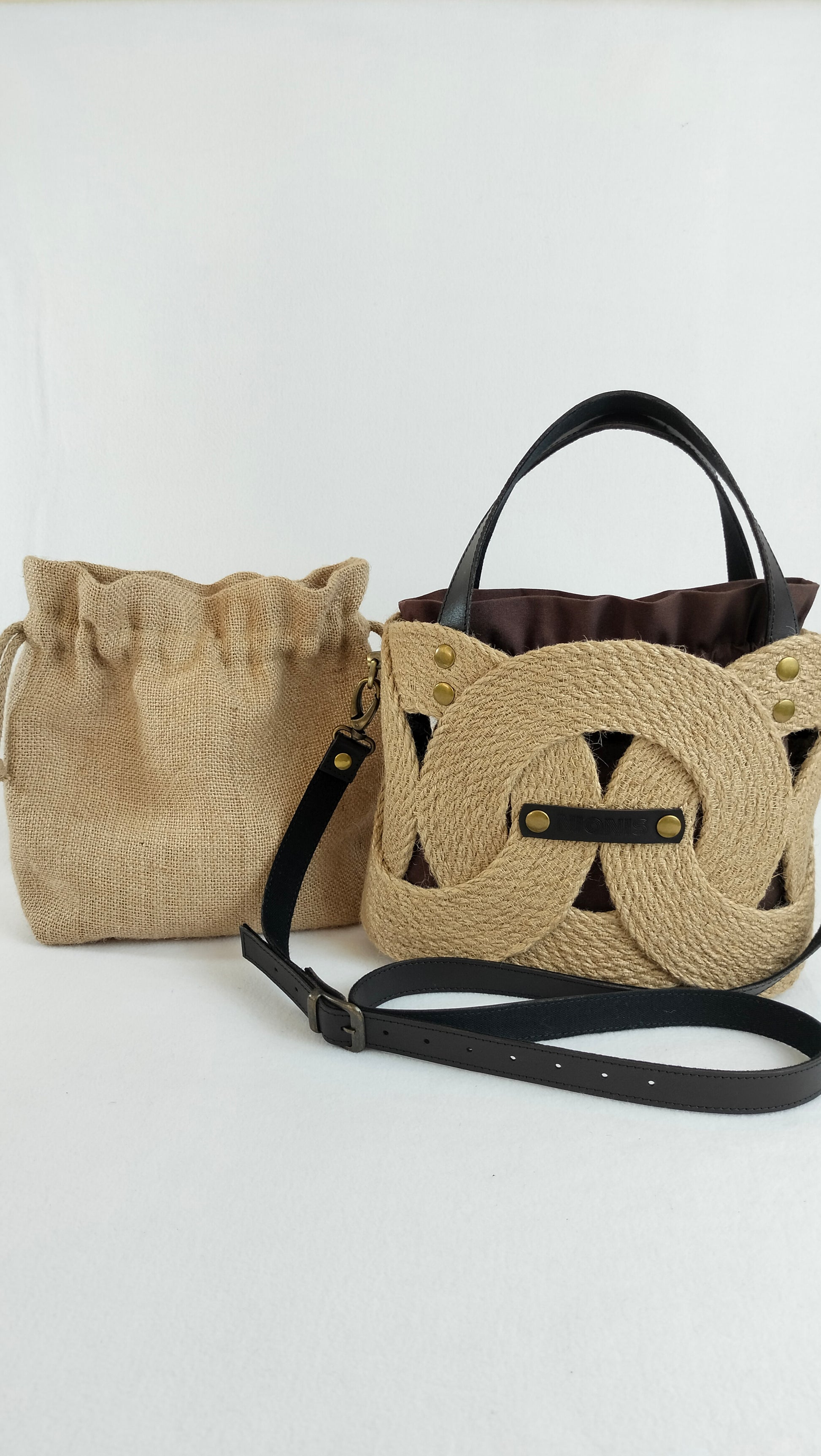 This medium-sized bag is crafted from durable jute and features genuine leather handles in a rich chocolate tone. Antique-style metal hardware adds a vintage charm and character.