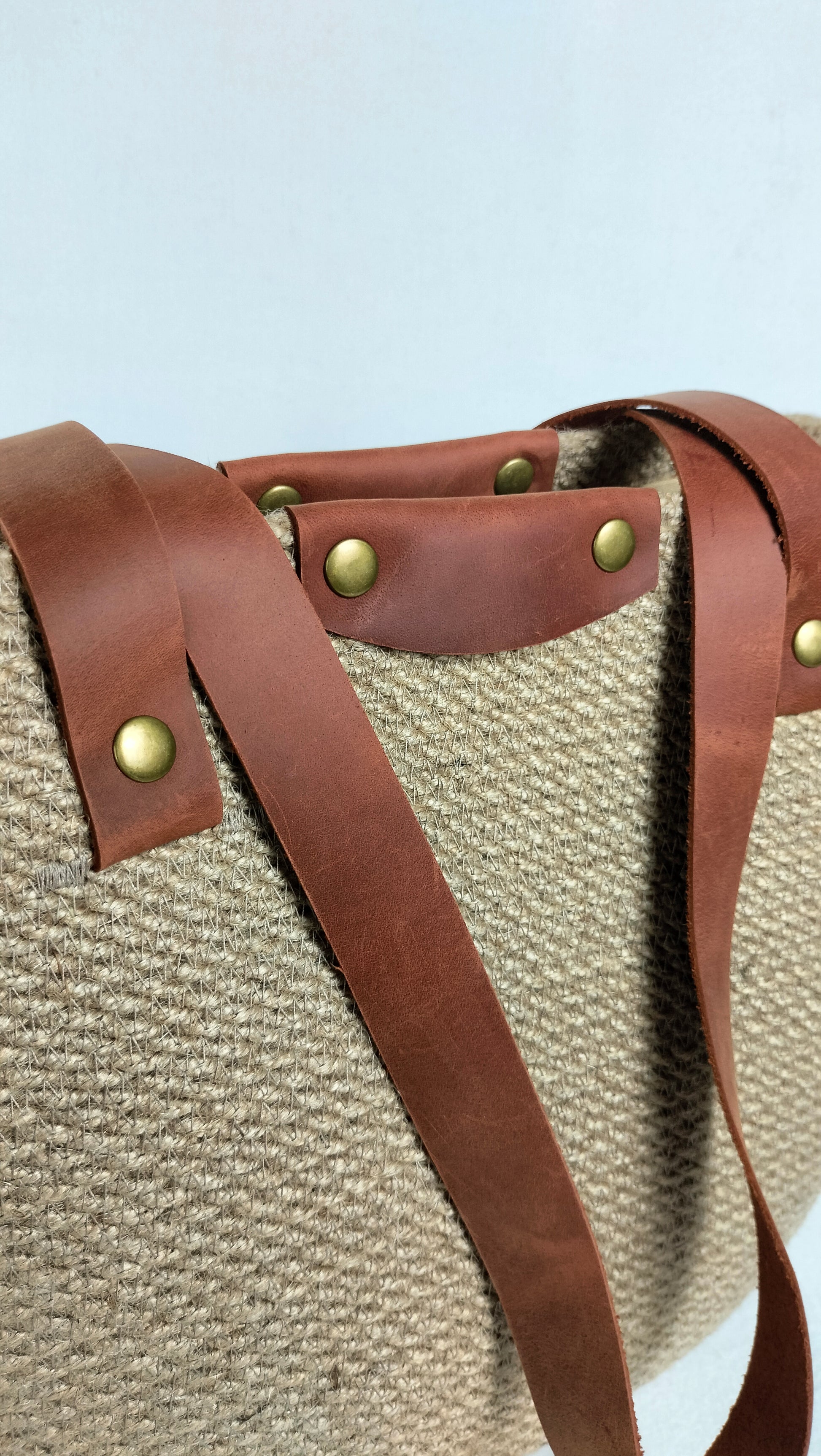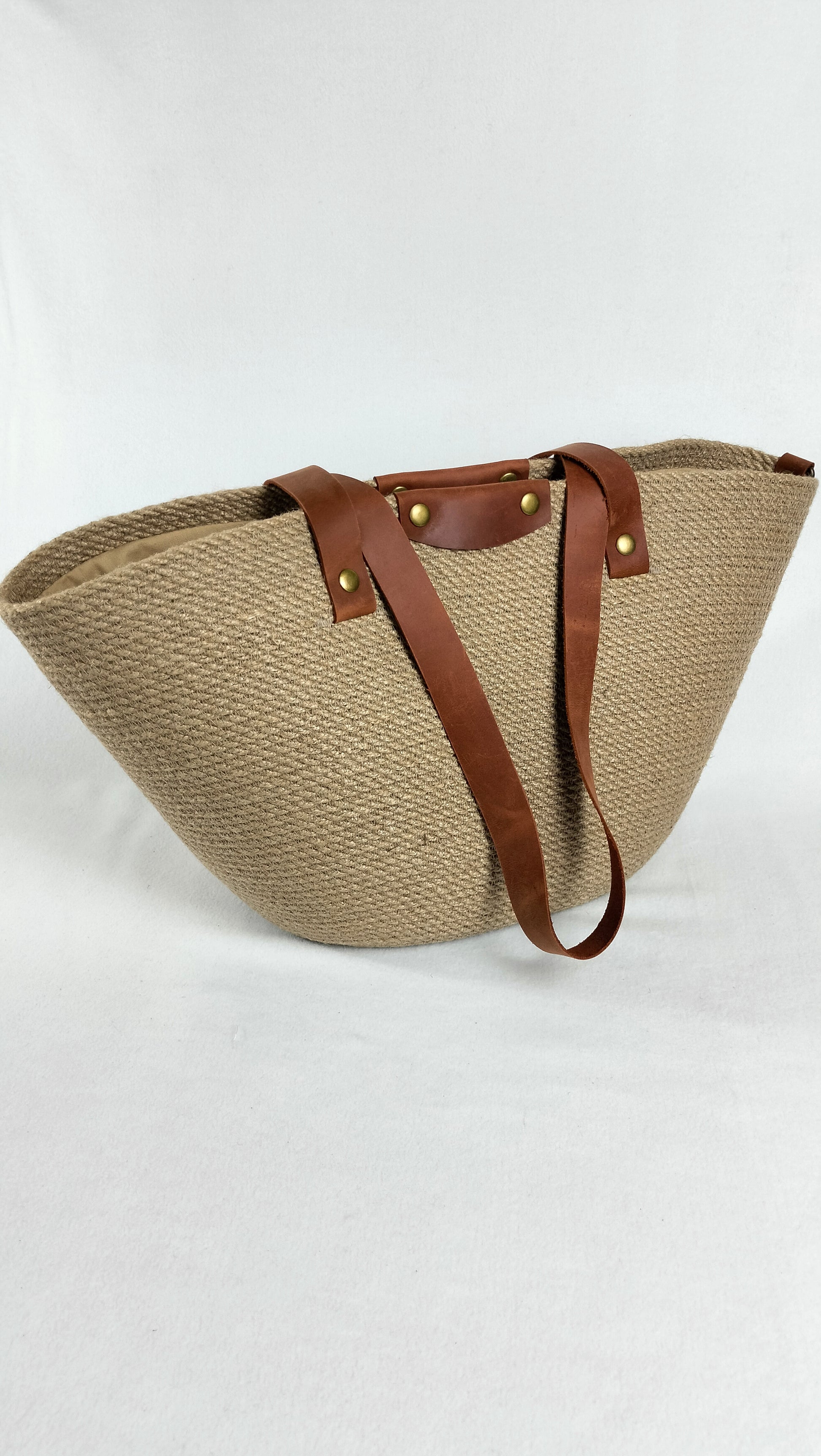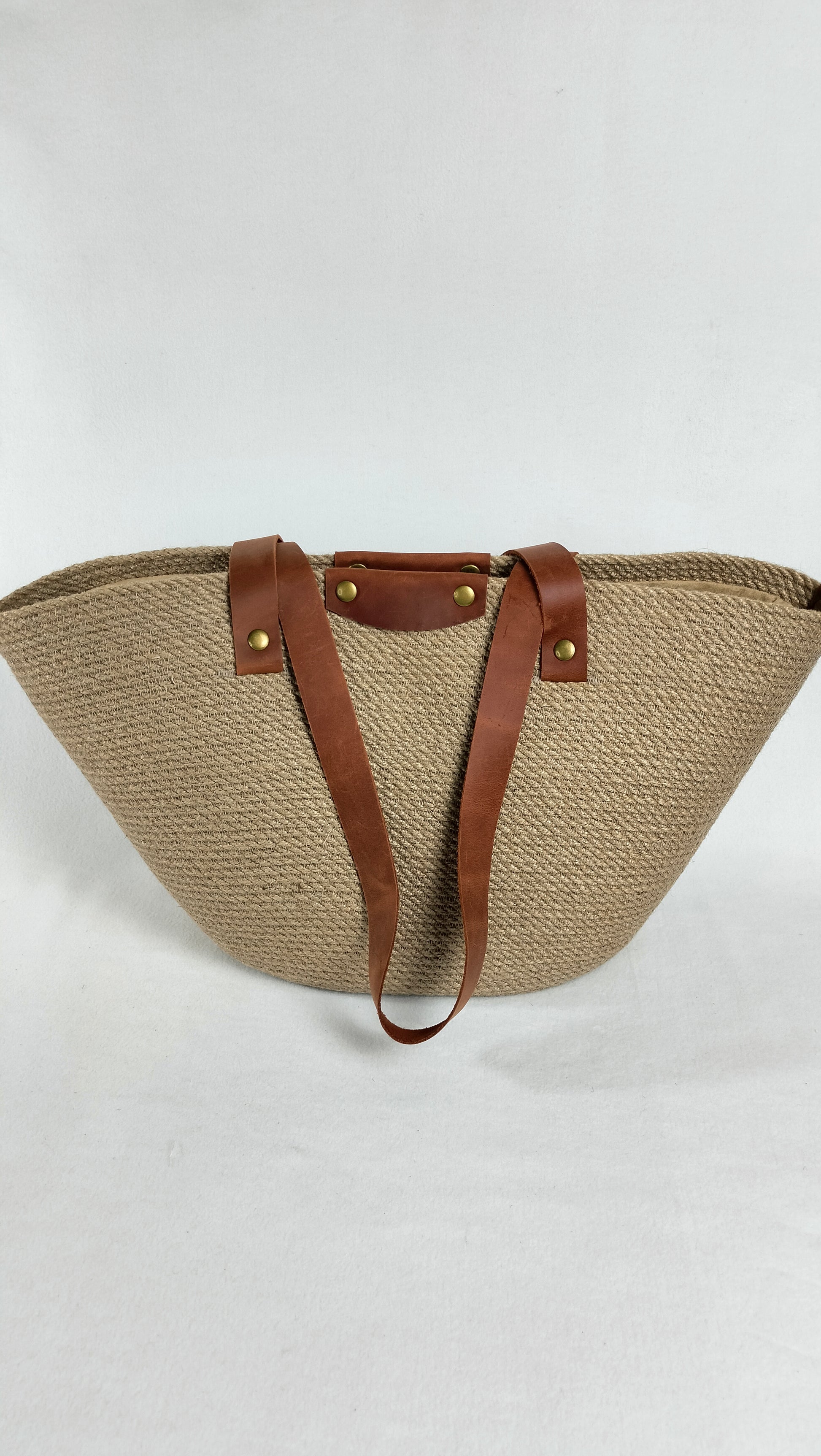 Handcrafted from durable jute and complemented with long shoulder straps in rich cognac leather, accented with antique-finish rivets, this bag blends vintage character with everyday function. It holds its shape beautifully while remaining lightweight and tactile.