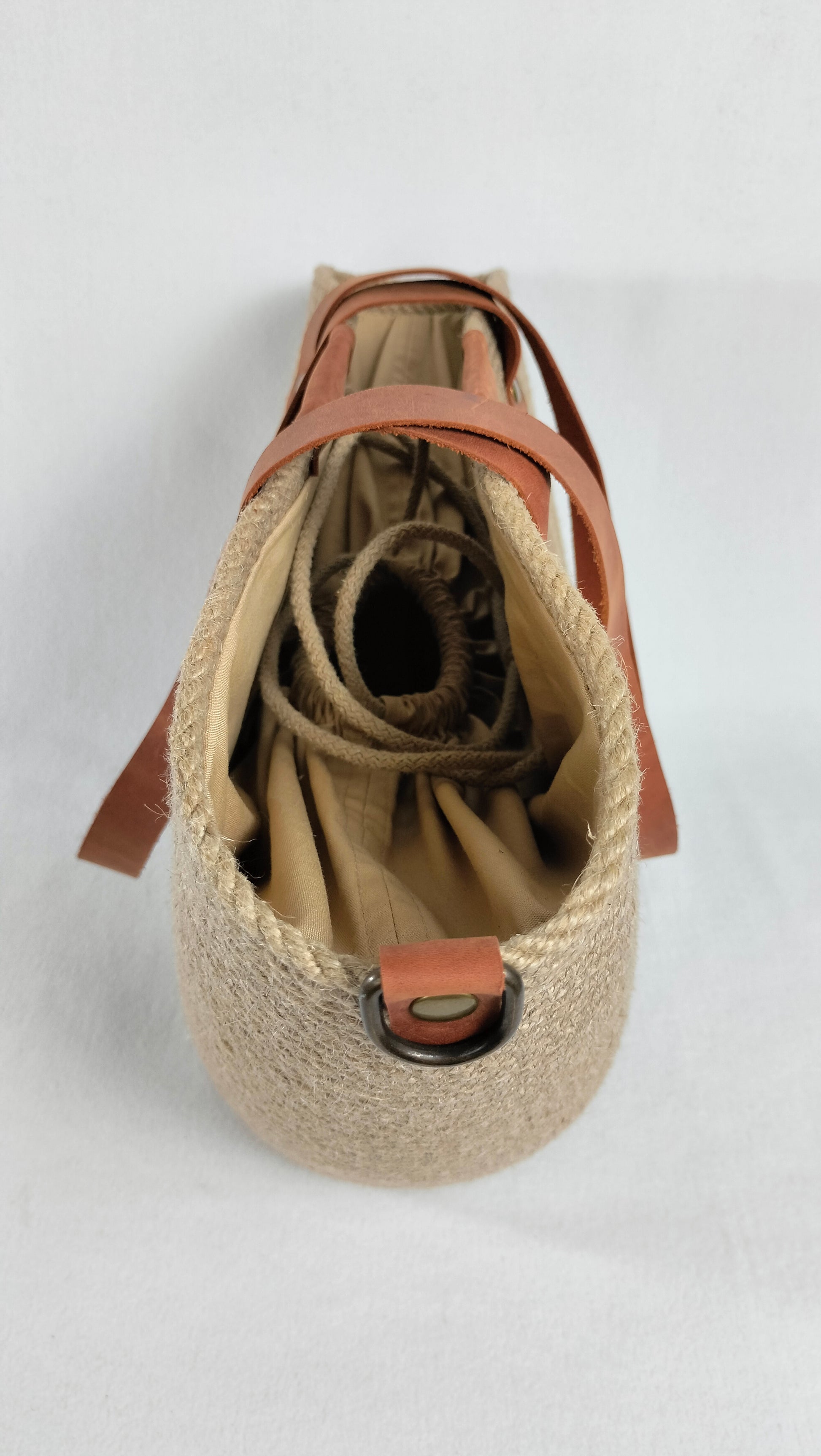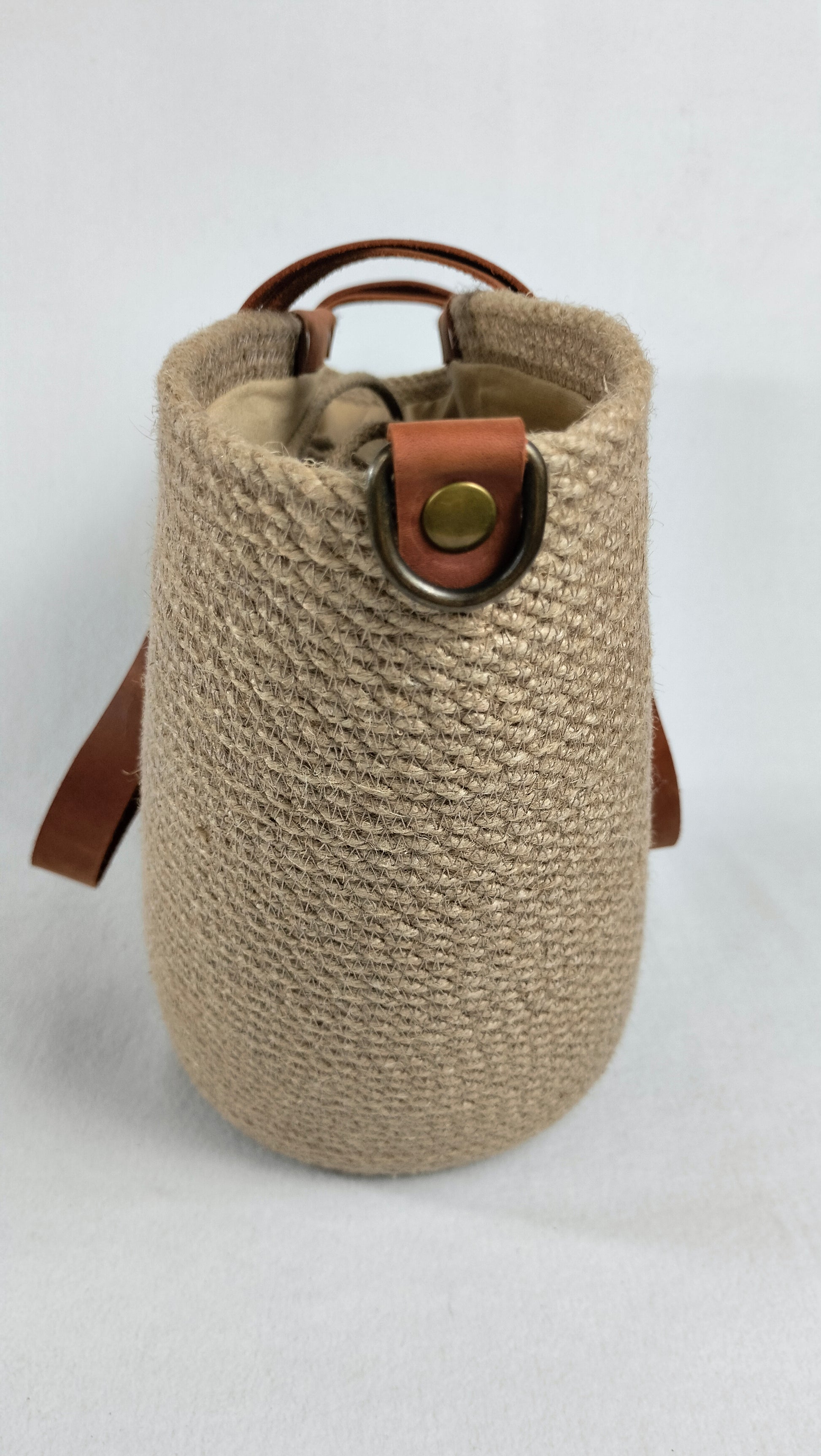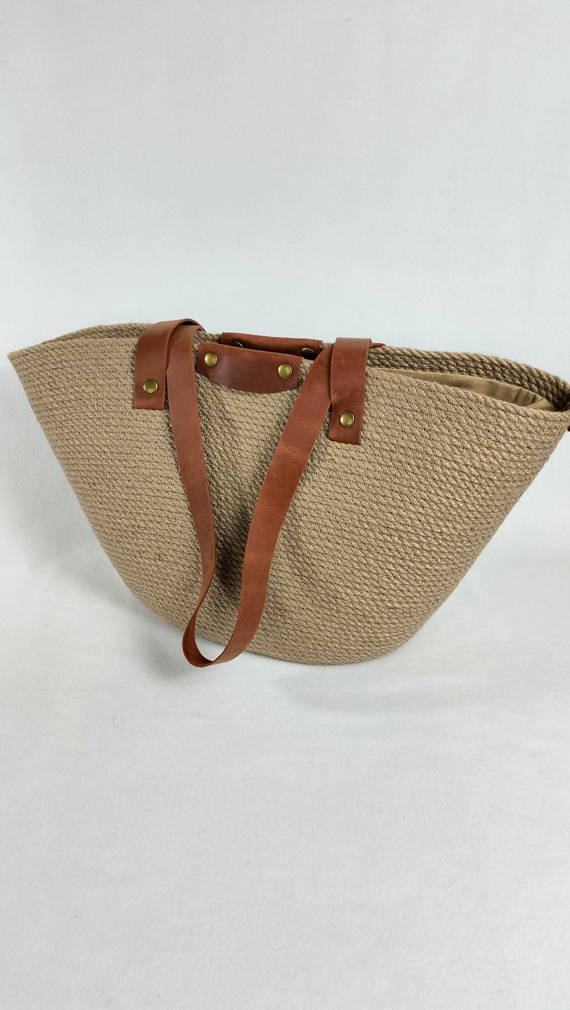 Handcrafted from durable jute and complemented with long shoulder straps in rich cognac leather, accented with antique-finish rivets, this bag blends vintage character with everyday function. It holds its shape beautifully while remaining lightweight and tactile.